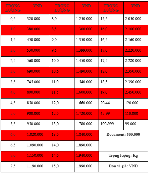 Chú ý: Dưới đây là bảng giá tham khảo về dịch vụ gửi hàng đi Trung Quốc tại Hà Nội của VietAviation.